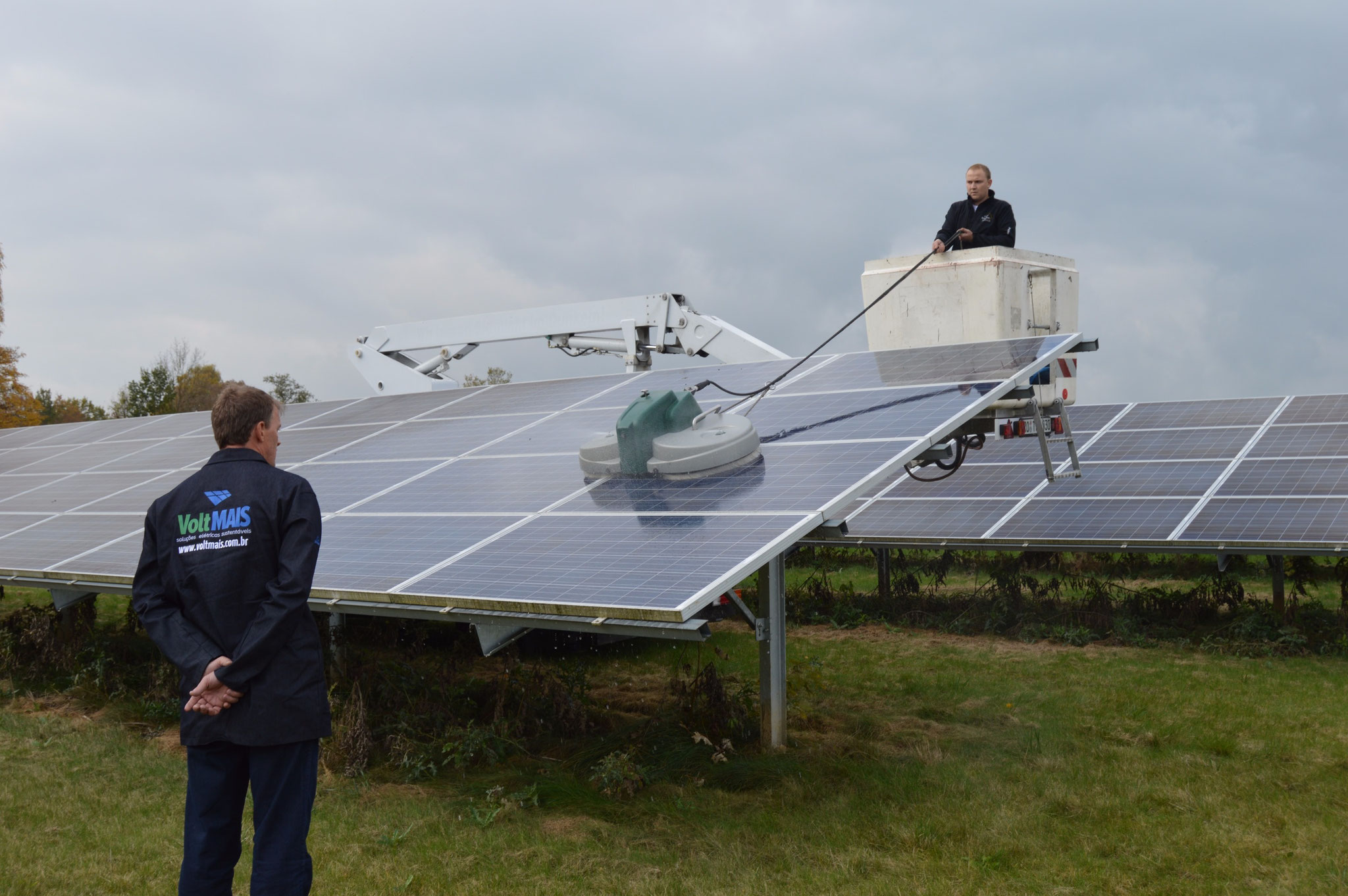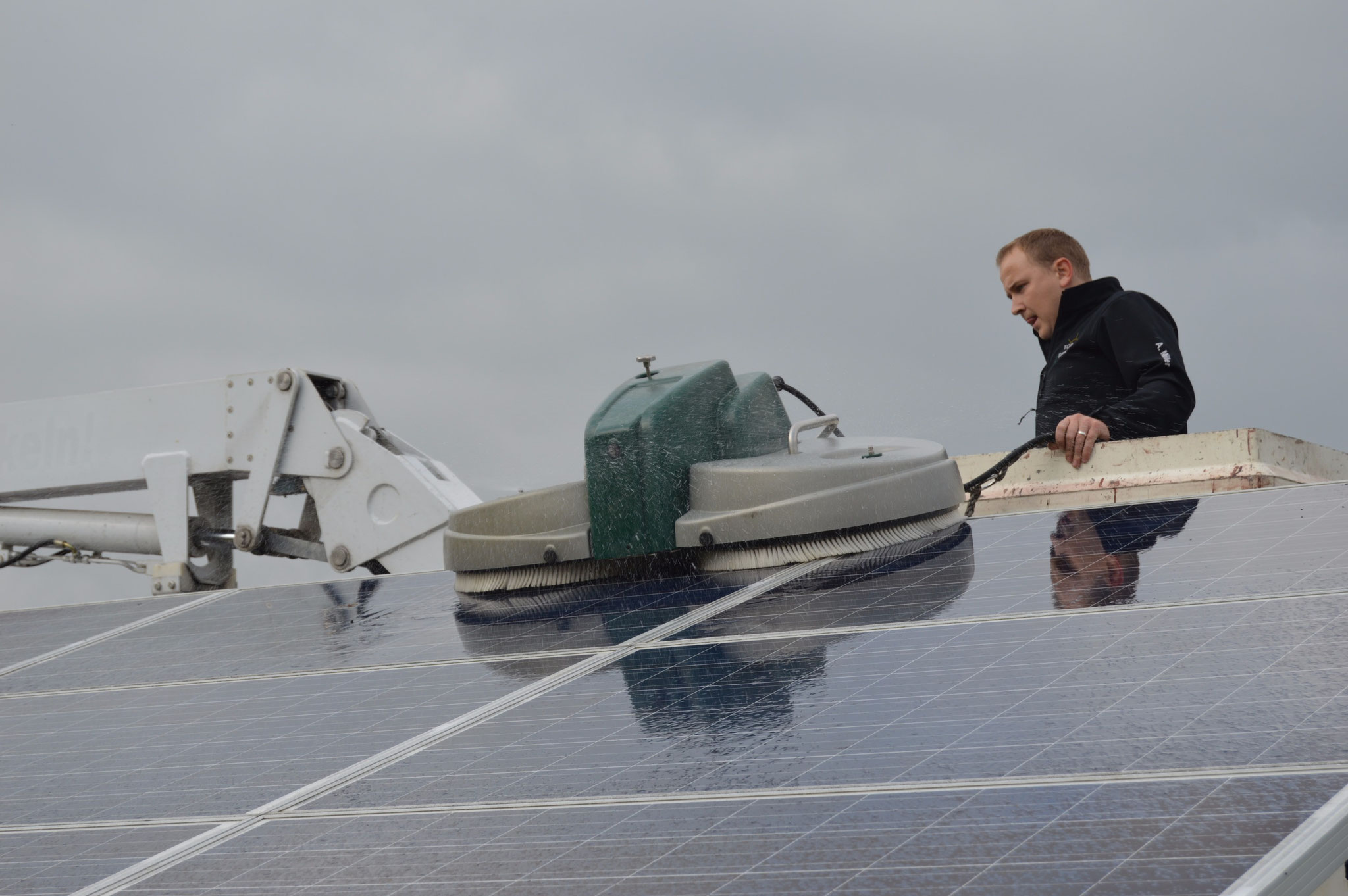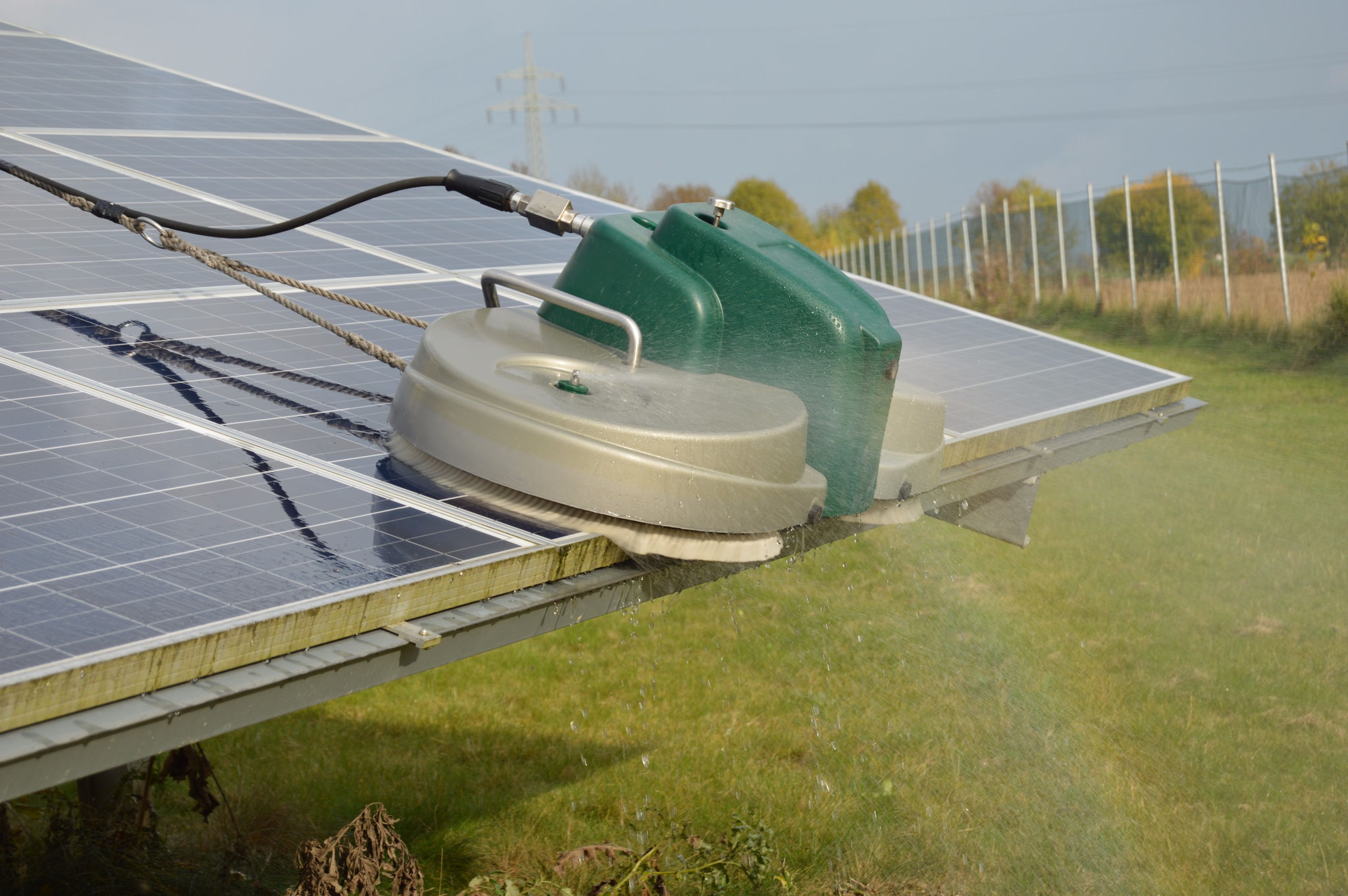 The new cleaning device PvSpin allows a swift and economic cleaning of big- surface solar plants that are covered with dirt. Especially solar plants on agricultural buildings with ridge ventilation become dirty already after a short time in operation. This results in yield losses of 15% and more. Cleaning systems that are operated manually are often uneconomic. However, cleaning robots are expensive and diflcult to transport. PvSpin is clean, quick and efficient, and easy to handle - so the PVSpin cleaning device will have paid itself ou after a short time.